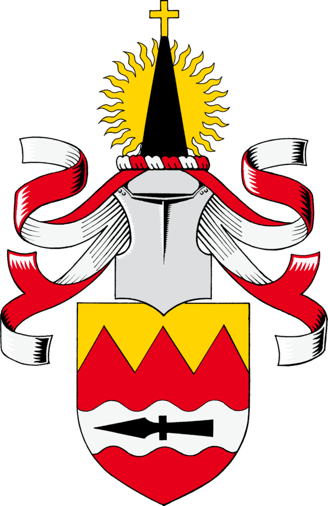 ”Punaisella kilvellä kultainen hammaskoroinen lakio; hammasvälejä kolme, alakentässä hopeinen aaltokorkoinen hirsi, jossa musta metsästyskeihään kärki hirsittäin. Pistokypärä. Kypäränpeite punainen, vuoripuoli hopeaa, lakipunos hopeaa ja punaista. Kypäränkoristeena kultainen liekkikoroinen ympyrä, jonka päällikkeenä nouseva musta kiila. Sen kärkenä Kultainen latinalainen risti.”